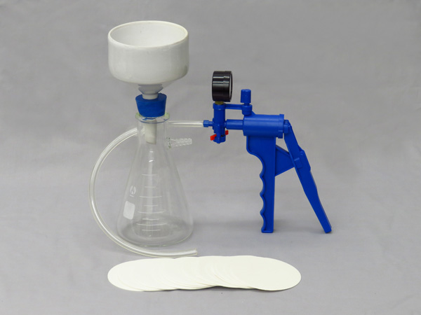Filtering Kit, 500 ml. Excellent kit for filtering. Consists of one each of Filtering Flask 500 ml, Porcelain Buchner Funnel 90 mm, Vacuum Pump Hand with Gauge, Filter Paper 90 mm Pack of 100 and rubber stopper with hole to accept Buchner Funnel. Packed in box for easy storage.
