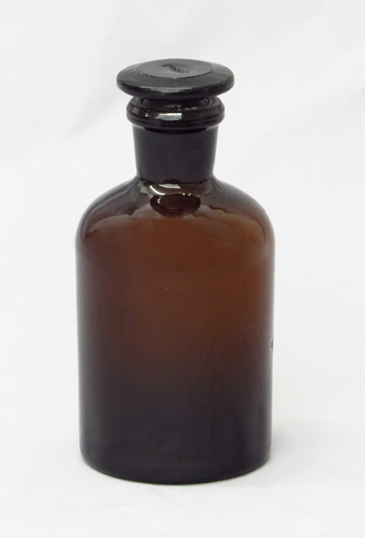 Amber Soda glass, narrow mouth, ground glass stopper.