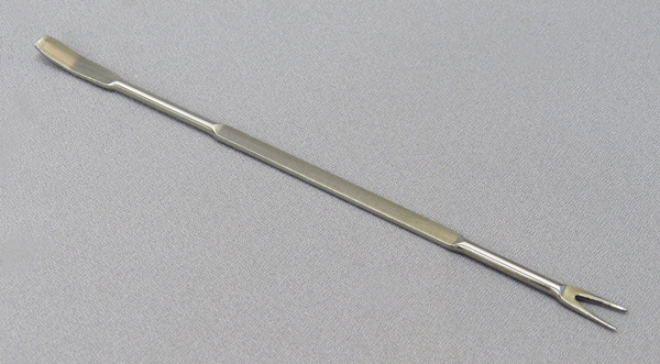 A sturdy spatula constructed of nickel plated steel. One bent end and one 2 pronged fork at the other end. A flat section is in the middle of the spatula for easy gripping. Great for breaking up solid materials.